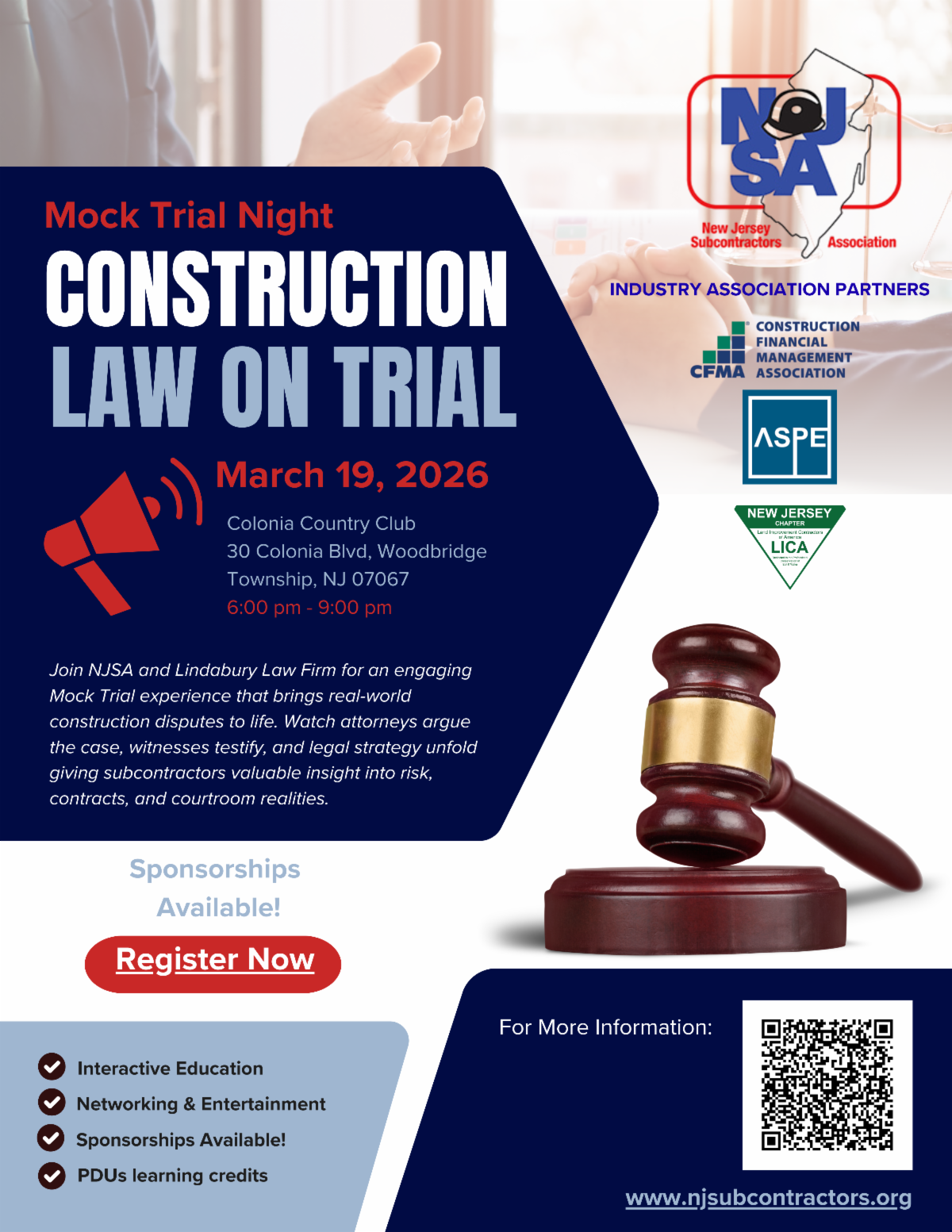 On March 19th, join Lindabury’s Construction Law group for an engaging Mock Trial experience. This event will take place at Colonia Country Club in Colonia, NJ from 5:30 – 9:00 p.m. This event will bring real world construction disputes to life. Watch attorneys argue the case, witnesses testify, and legal strategy unfold-giving subcontractors valuable insight into risk, contracts, and courtroom realities.